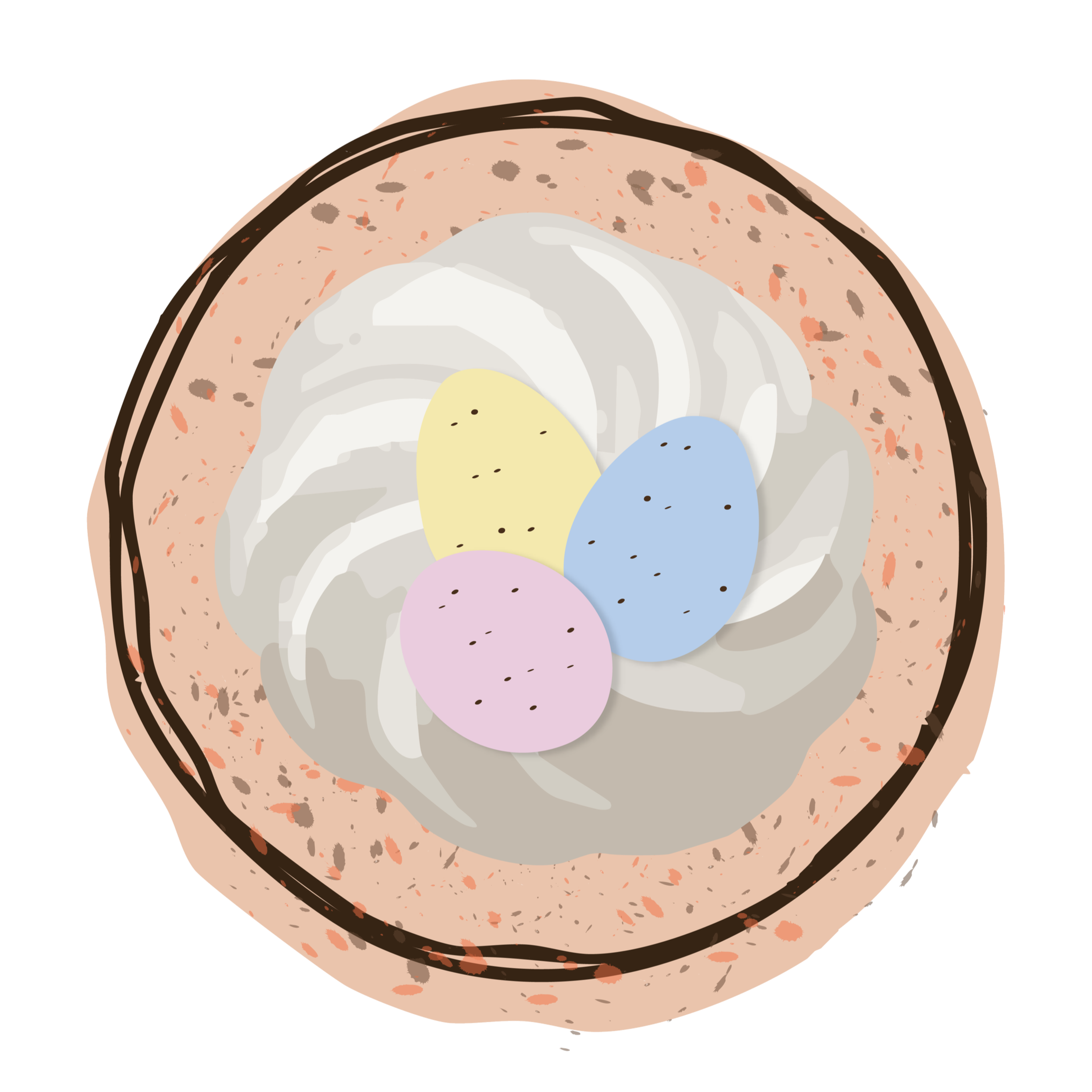 A cookie infused with carrot cake spices, shaved carrots, and chopped pecans, topped with cream cheese icing and chocolate speckled eggs.